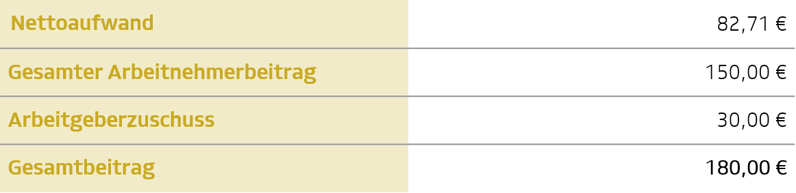 Sie erhalten auf Ihren Eigenbeitrag die staatliche Förderung und einen Arbeitgeberzuschuss von 20%.
