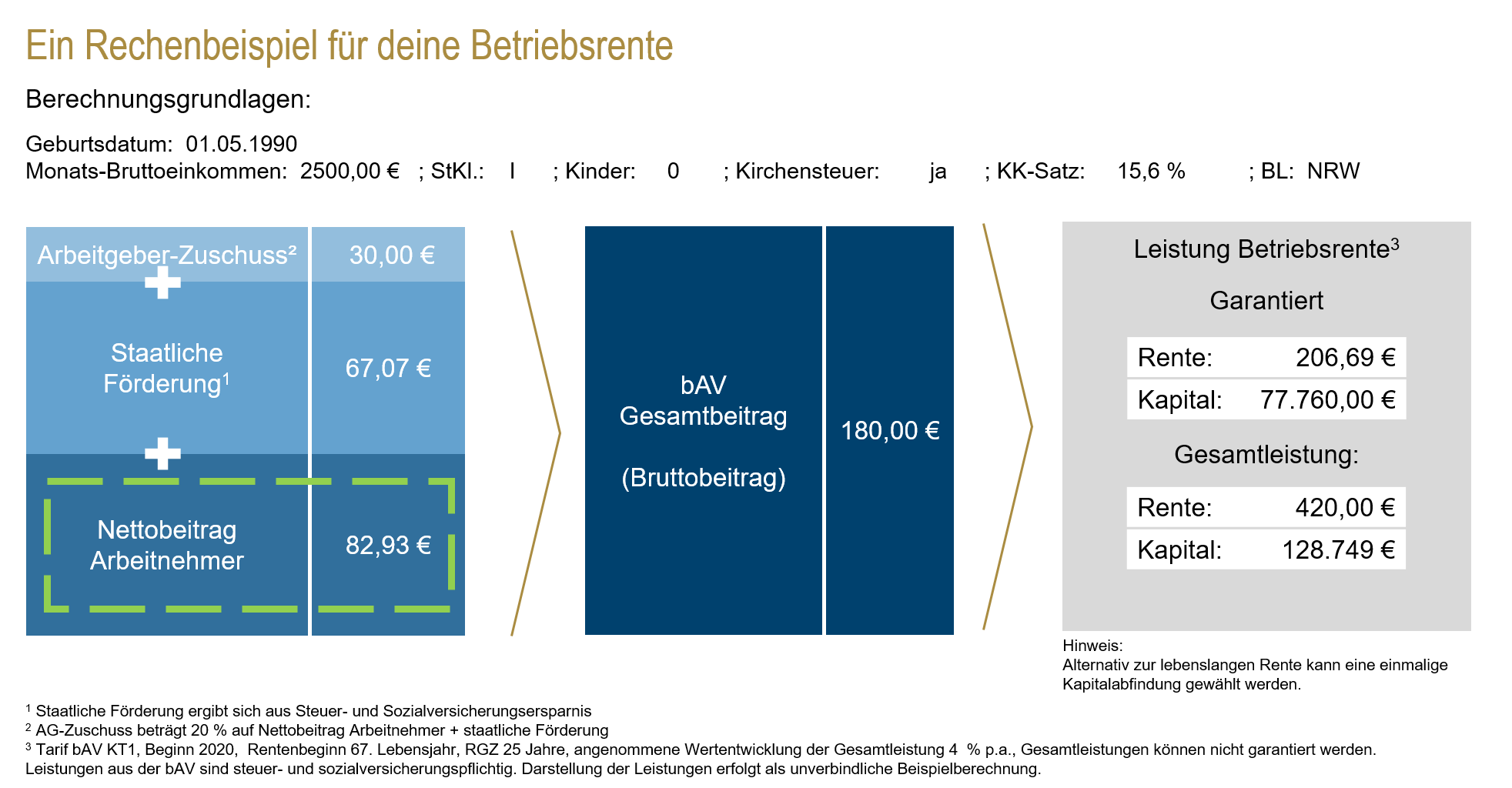 Mit unserer Betriebsrente haben Sie die Chance, in der andauernden Niedrigzinsphase Steuervorteile zu nutzen und gleichzeitig Ihre Altersrente lebenslang aufzubessern. Nutzen Sie die staatliche Förderung durch die Einsparung von Steuern und Sozialversicherungsbeiträgen als Rendite-Extra! Zusätzlich profitieren Sie von einem unserem Arbeitgeberzuschuss.